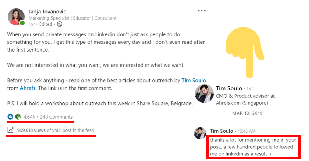 Je li kasno za vas da se sada aktivirate? Nije, jer LinkedIn kontinuirano raste. Imate mogućnost postizanja značajnog reacha organskim putem, što je kod Facebooka i Instagrama gotovo nemoguće za ljude koji nisu influenceri. Ovo je jedan od mojih postova koji je imao 909 618 pregleda, 4 646 oznaka like i 248 komentara.