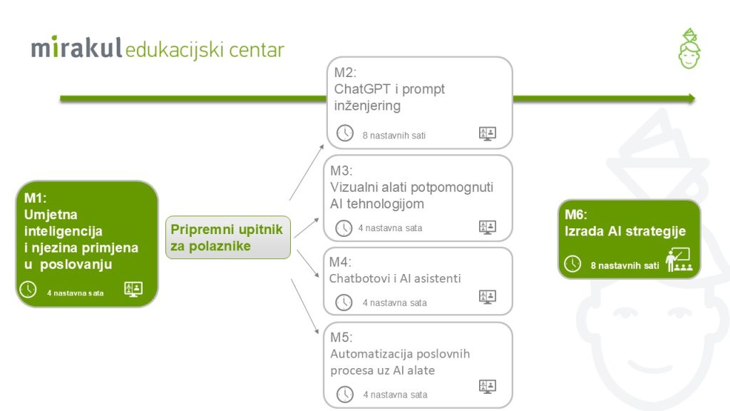 Kroz edukaciju, sudionici će dobiti uvid u strategije i metode za upravljanje organizacijskim promjenama koje su nužne za uspješnu integraciju AI, uključujući angažman zaposlenika, razvoj kulture inovacija, i adaptaciju poslovnih procesa. Polaznici će se upoznati s praktičnim koracima za pilotiranje, evaluaciju i skaliranje AI projekata, uključujući kako mjeriti uspjeh i ROI, te kako osigurati da AI inicijative doprinose dugoročnim poslovnim strategijama i ciljevima.